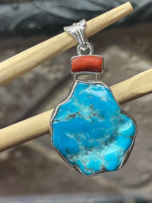 Natural Sleeping Beauty Turquoise, Coral 925 Solid Sterling Silver Pendant 40mm