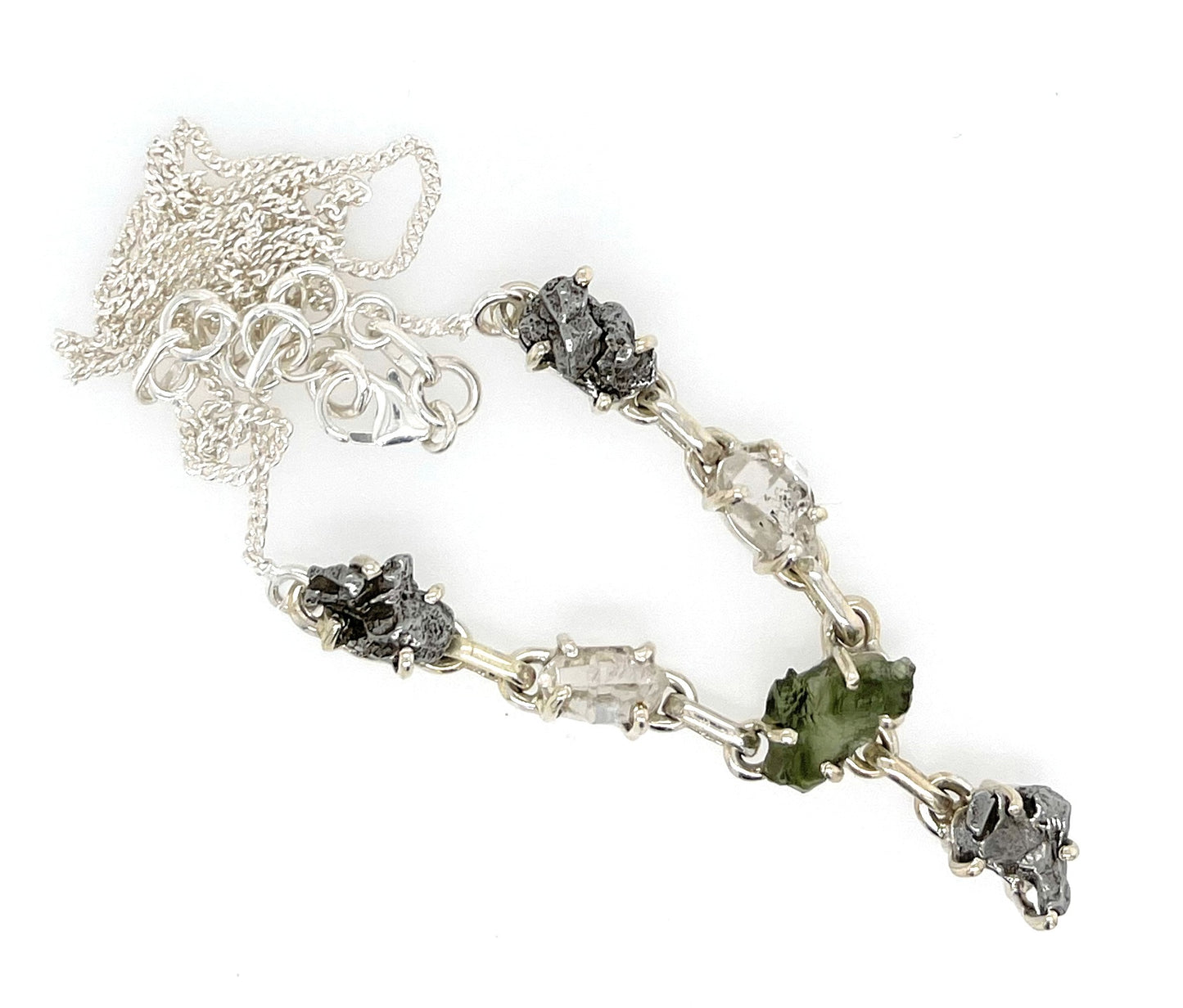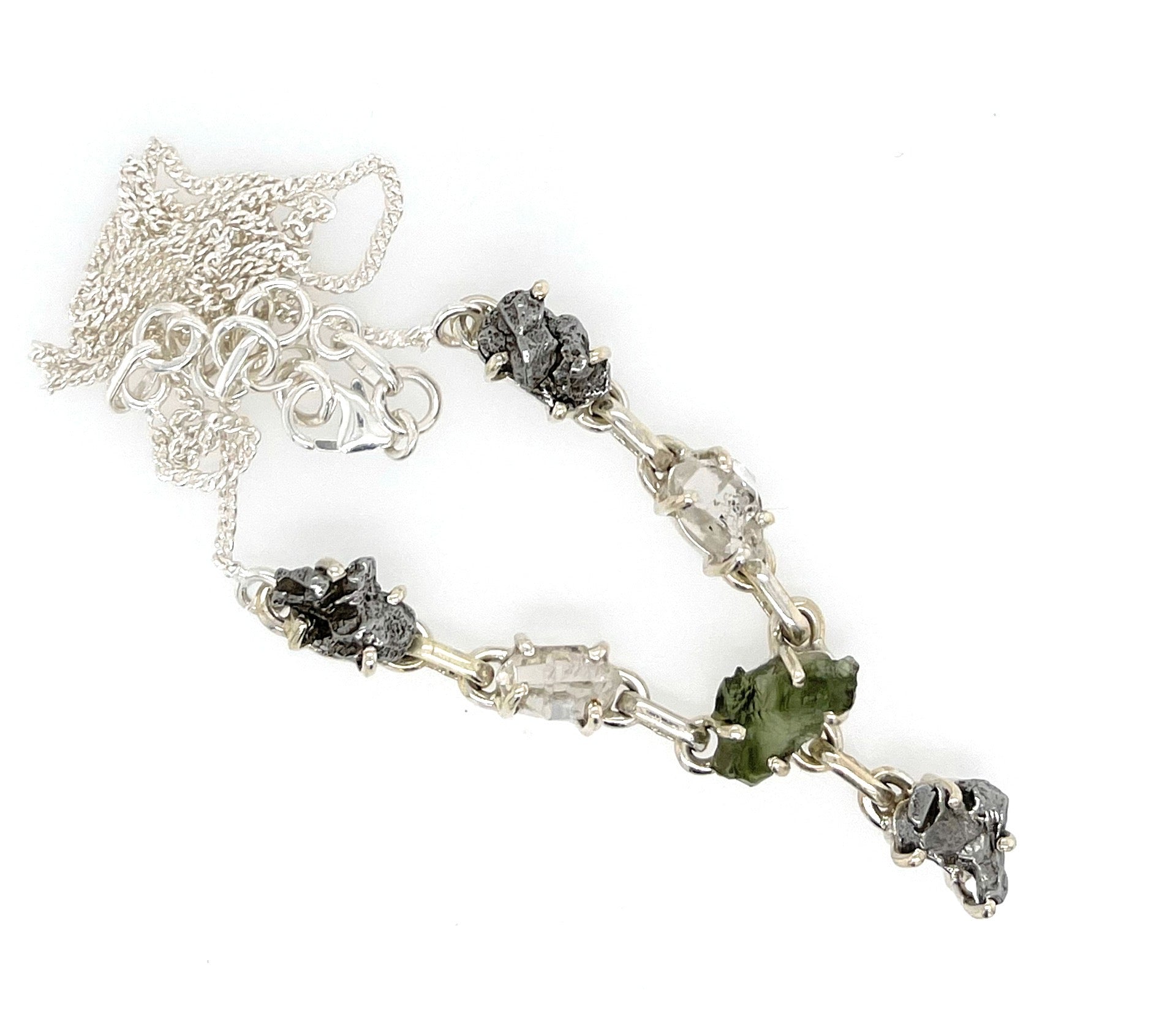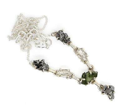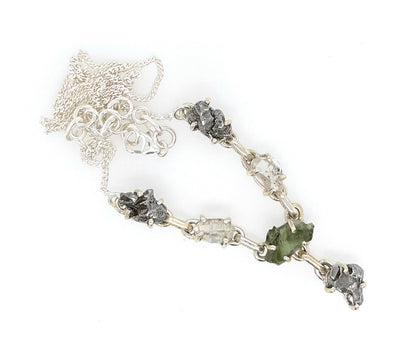 Natural Green Moldavite Herkimer Diamond Meteorite Campo Del Cielo 925 Sterling Silver Necklace 17'