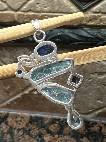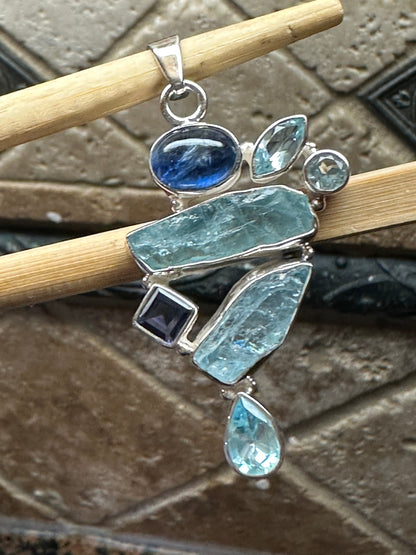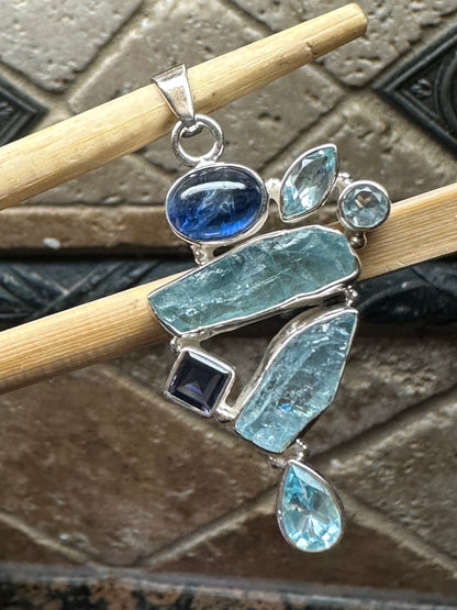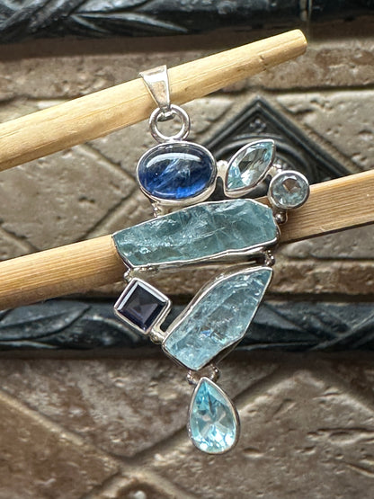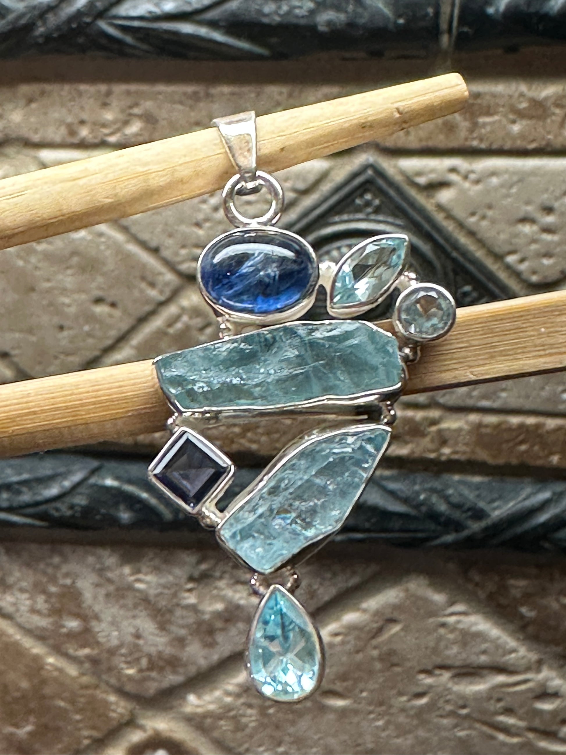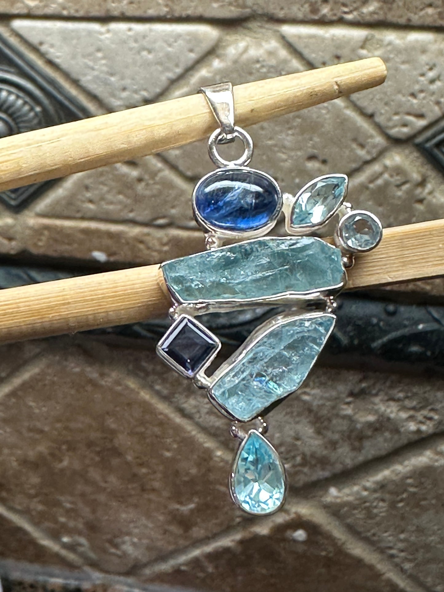 Natural Aquamarine, Kyanite, Blue Topaz, Iolite 925 Solid Sterling Silver Pendant 45mm